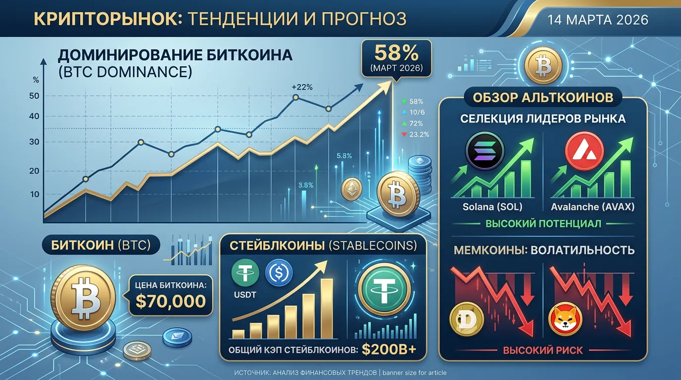 14 марта 2026 года криптовалютный рынок демонстрировал явный сдвиг в сторону консервативных стратегий. Биткоин укрепил свое лидерство, достигнув доминирования на уровне 57-58%, что стало максимумом за последние месяцы. Инвесторы все чаще предпочитают проверенные крупные активы и стабильные монеты, оставляя спекулятивные альткоины в тени. Этот тренд отражает зрелость рынка, где качество проектов начинает преобладать над количеством.